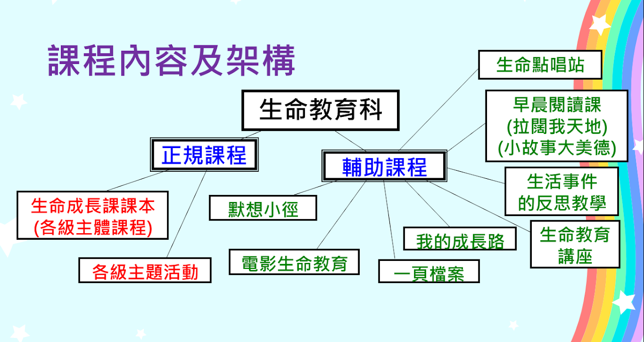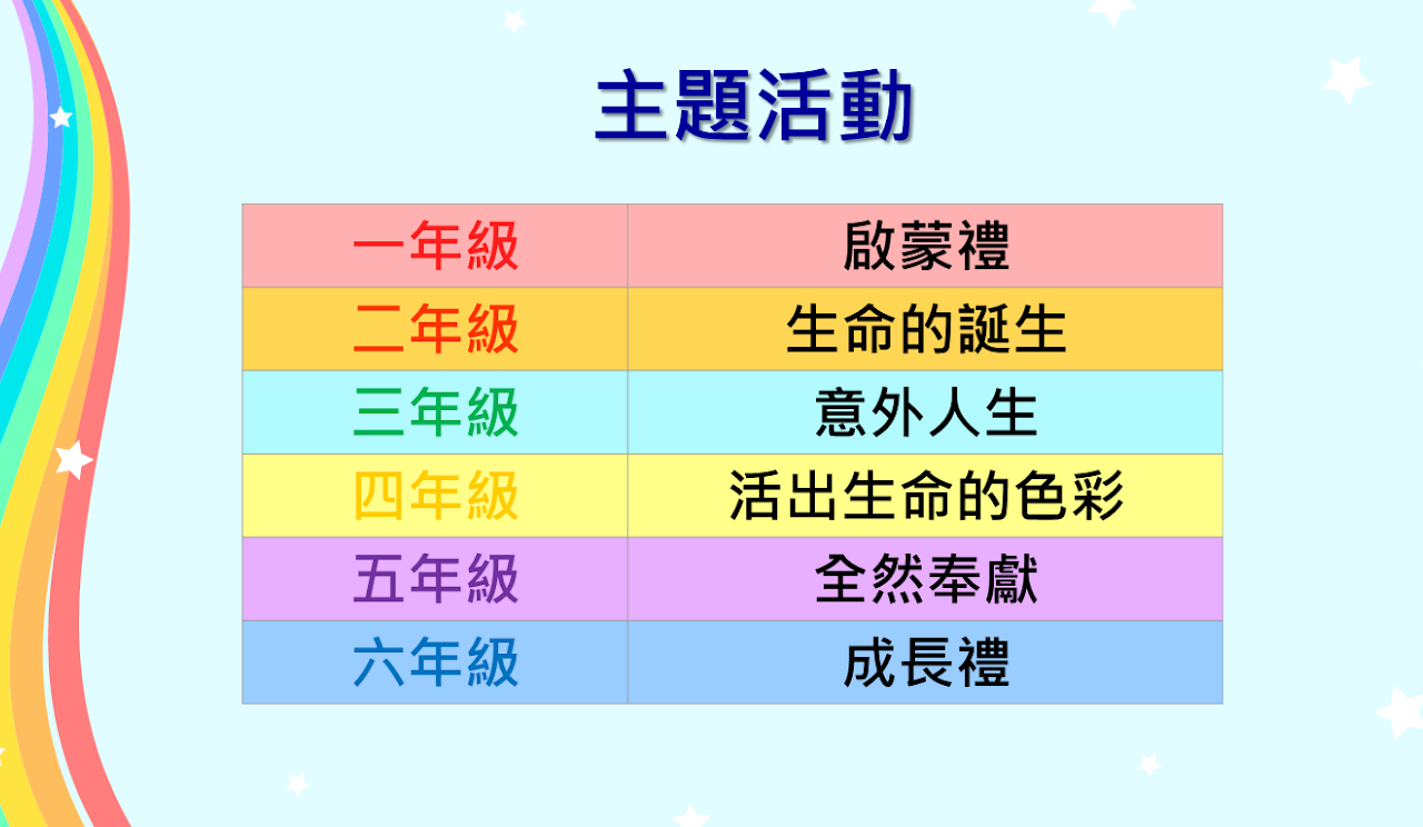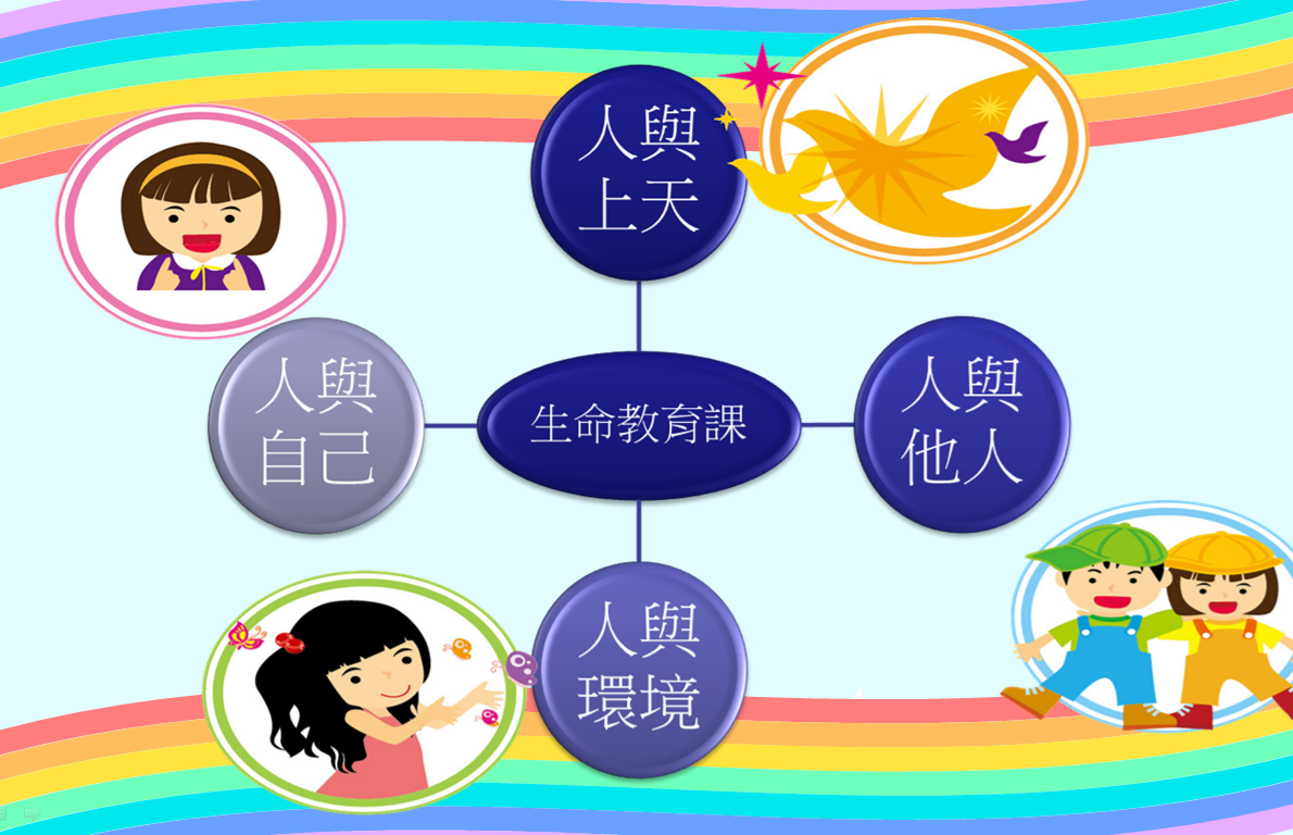 一.目標 A. 幫助學生建立正面價值觀念,適當態度及良好行為。B. 培養學生樂於學習的態度,發展潛能,實現自我。C. 培養學生自愛自信,塑造出基督化整全的人格。 二. 課程內容及架構 三. 生命成長課課本─讓生命高飛 四. 課程分四個向度 五. 各級主題活動 六. 課程特色 讓學生從生活中、經驗中學習。讓學生獲取成功、被激勵、被接納、被肯定及被認同。著重學生分享個人感受及觀感。課程及活動設計配合學生的成長階段需要。刻意安排情景及體驗給學生,以帶出核心價值,如堅毅、珍惜生命、積極。加入基督教元素。多元化教學,如體驗活動、繪本教學、電影欣賞、默想小徑課、詩歌、遊戲、分享等。