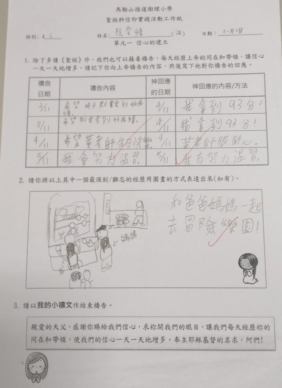 2.5 一年級聖經科任需要教導學生祈禱的意義、祈禱應有的態度、主禱文的內容及如何使用啟應經文,並介紹生命集。