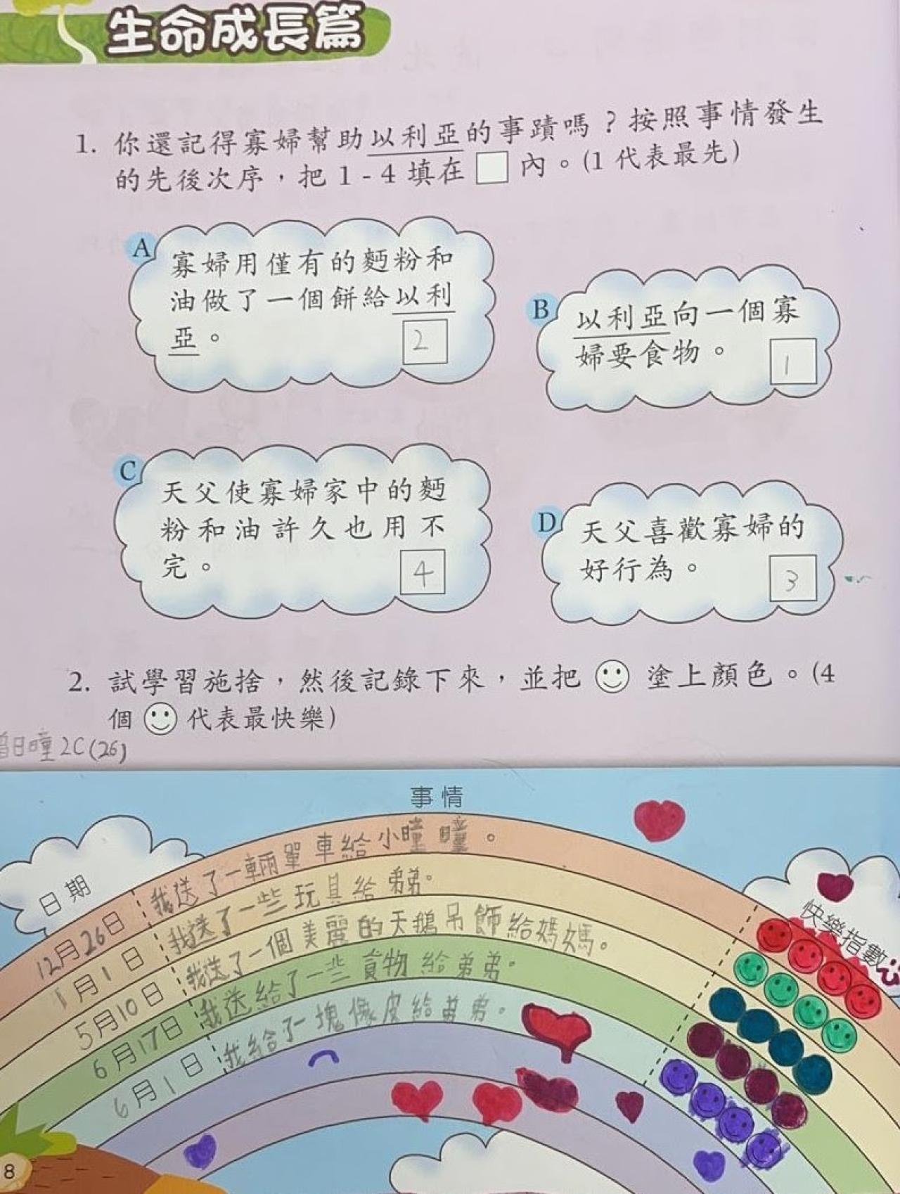 2.1 每學期在科會中,同級科任商議選取課文教授,教授時段宜配合基督教節期。每課節均須完成聖經活動冊,並加以批改。老師透過課堂活動,引導學生完成聖經活動冊之開放式題目。
