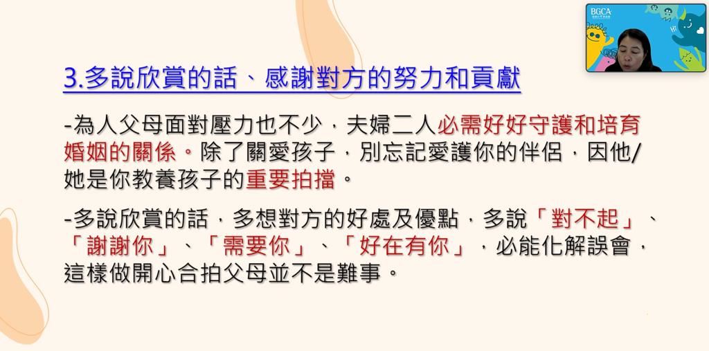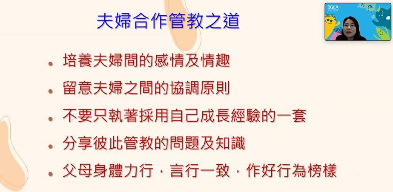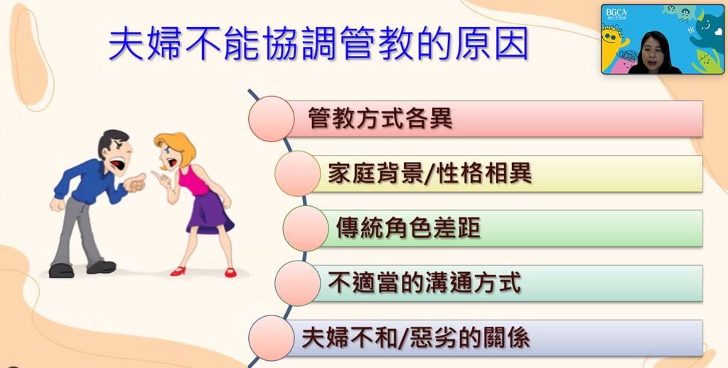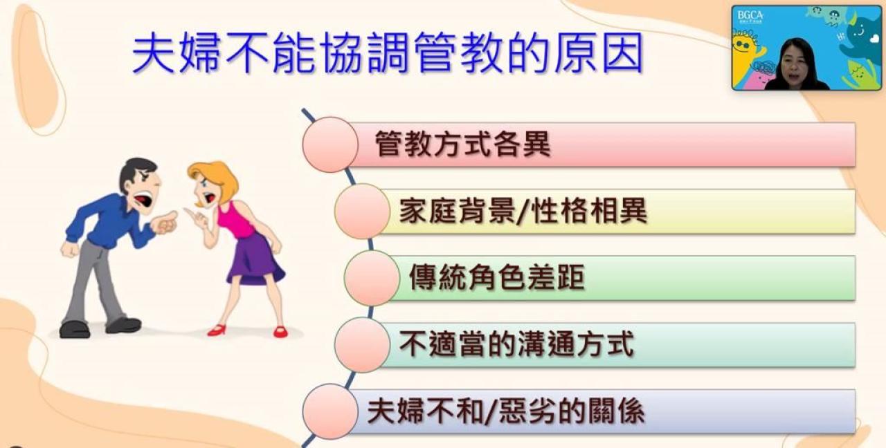 本校透過舉辦「提升夫婦協調管教孩子」家長講座,探討引起夫婦管教不一致的原因,促進家長共同學習如何協調夫婦的管教模式。