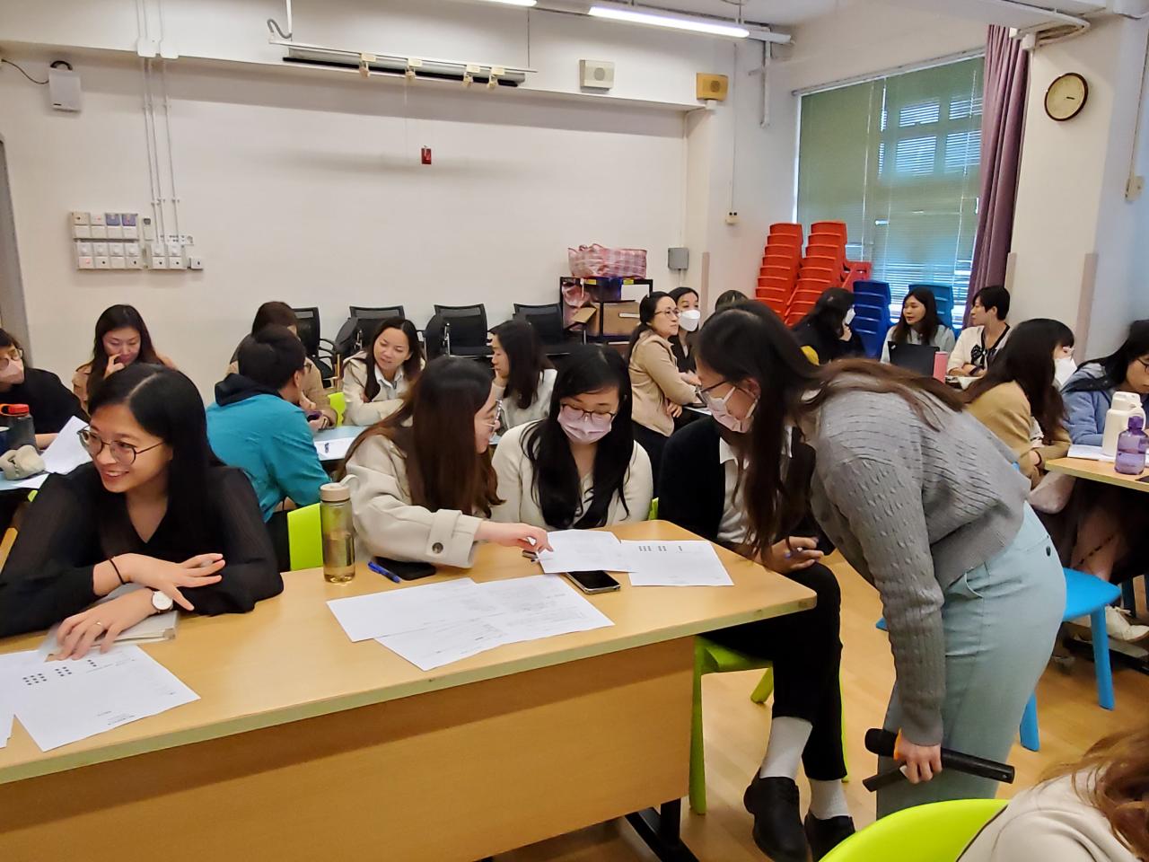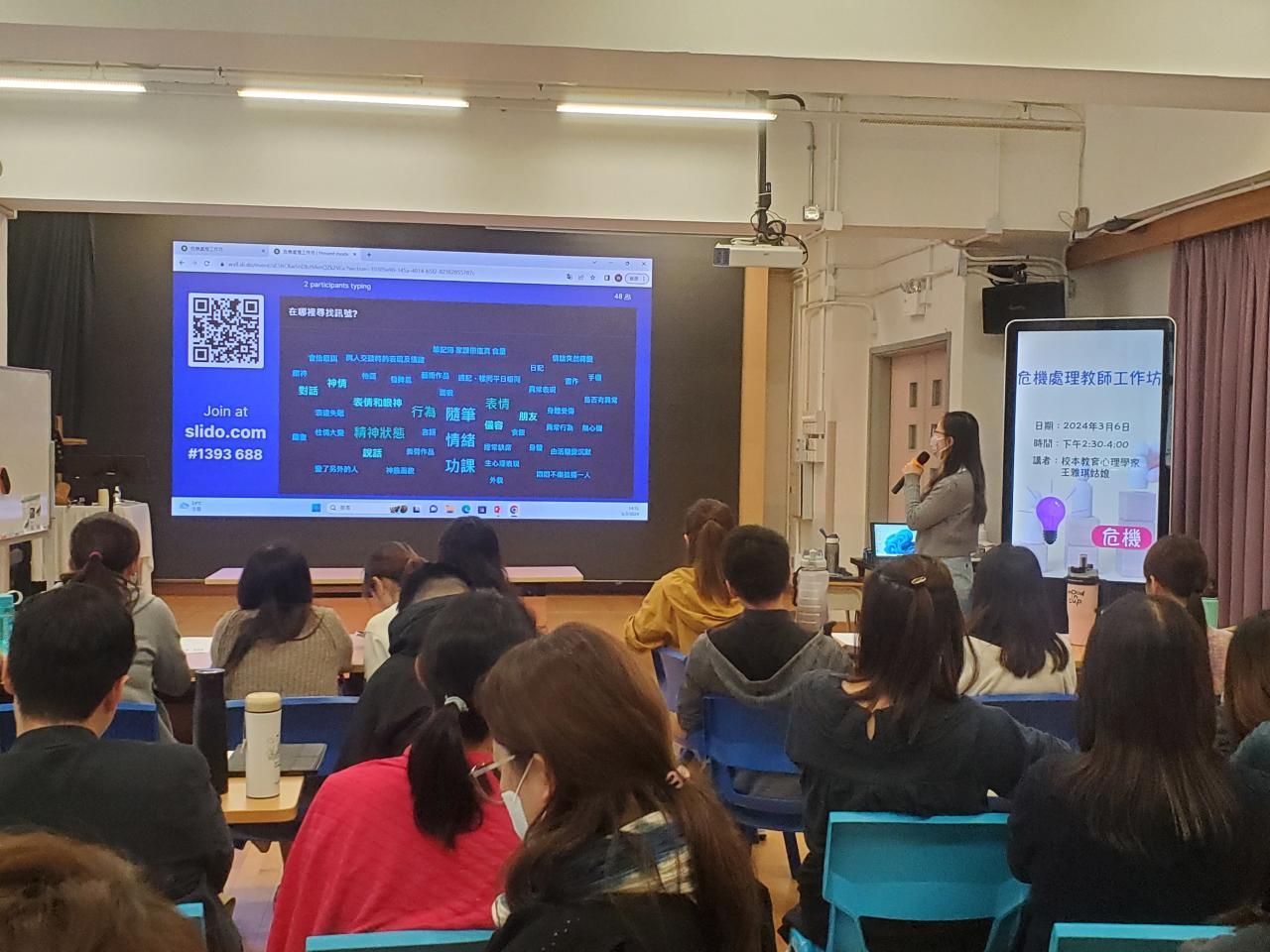 是次活動邀請本校教育心理學家王雅琪姑娘主講,以處理學童自殺為題。教師透過小組討論及情景演練,以提高教師識別及支援有自殺風險學生的能力及技巧。