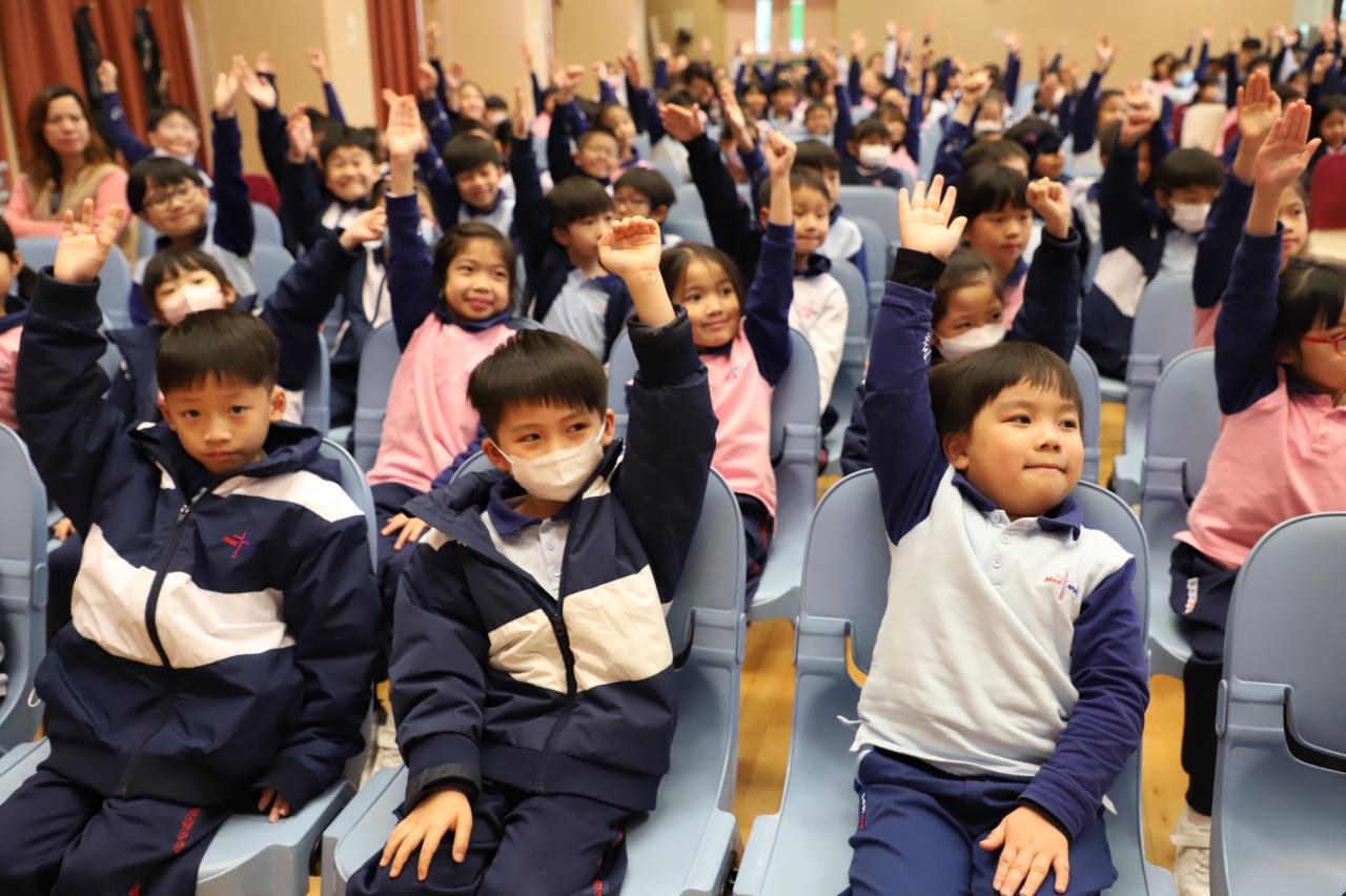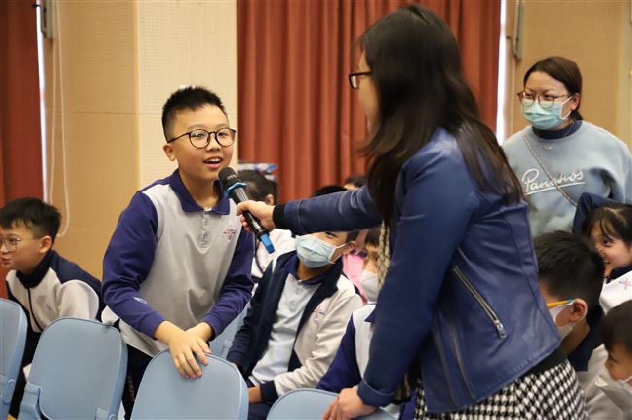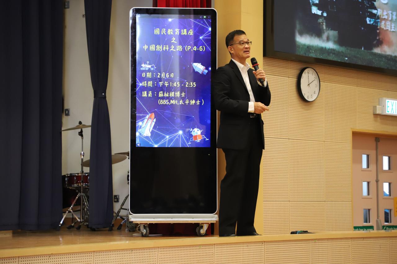 2024-02-06 德育、公民及國安教育組為提升學生的國民身分認同,於周會時段邀請不同的講者進行國民教育講座,低年級以魔術及故事的形式讓學生多認識中國的文化,例如造紙術、飲食文化、故宮建築及新年的節日特色等。高年級則邀請了蘇祉祺博士以專題的形式講解中國創科之路的發展,同學們都很投入,並踴躍地向蘇博士提出不同的問題。